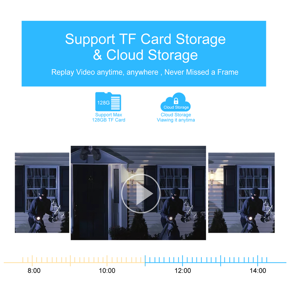 - Storage: Support cloud storage, memory card storage MAX 128GB.